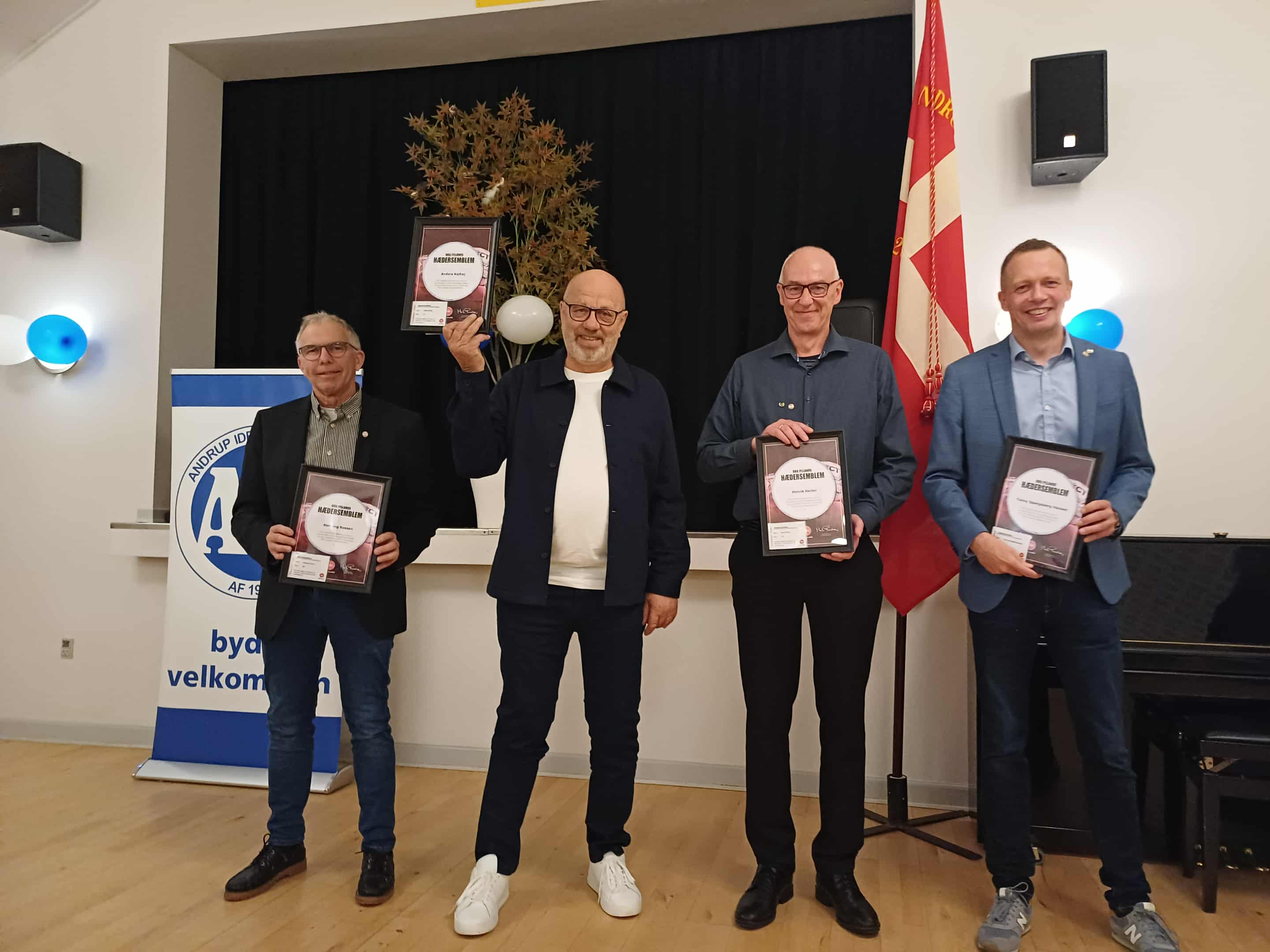 Tonny Spangsberg Hansen, Henrik Herter, Henning Rossen og Anders Kajhøj modtog DBU Jyllands Hædersemblem for min. 20 års frivilligt foreningsarbejde af formanden for DBU Jylland, Bent Clausen).